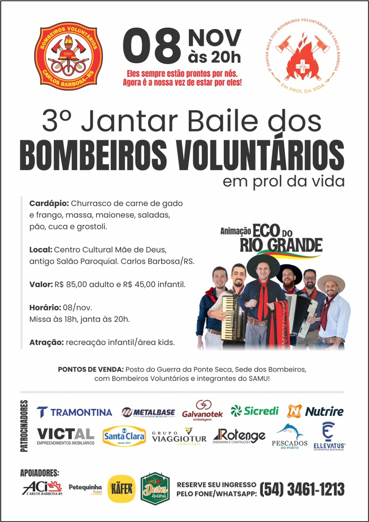 Os Bombeiros Voluntários de Carlos Barbosa, convidam a todos, para o 3º Jantar Baile em prol da vida, que acontecerá no dia 08 de novembro, às 20h, no Centro Cultural Mãe de Deus (antigo Salão Paroquial).