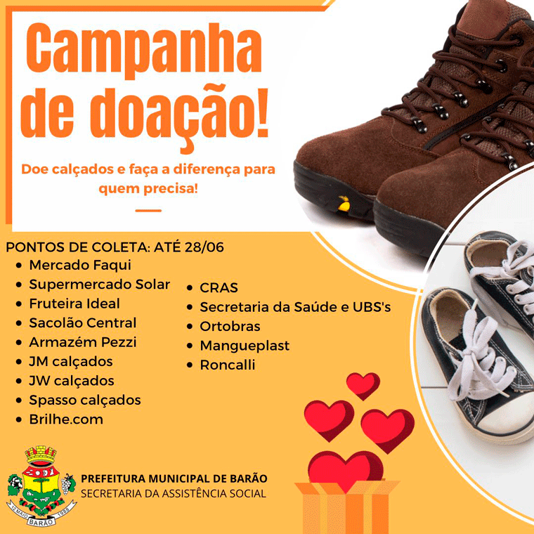 Até 28 de junho, em diversos pontos do município, será possível doar calçados de todos os tamanhos, em bom estado, que posteriormente serão doados!