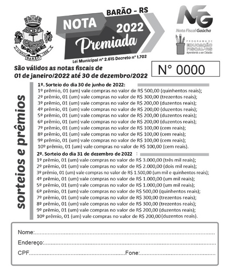VENDA A CONSUMIDOR e PRESTAÇÃO DE SERVIÇOS: Será fornecida uma cautela a cada R$ 100,00 (cem reais), até o máximo de 5 (cinco) cautelas por nota fiscal ou cupom fiscal, ou uma cautela a cada R$ 100,00 (cem reais) em notas ou cupons acumulados. Serão consideradas Notas Fiscais a Consumidor Final, proveniente de empresa com inscrição no ICMS, no Município de Barão, fornecido ao usuário final, pessoa física na qual conste o CPF do comprador na nota fiscal ou cupom fiscal;